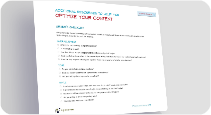 Go Back to Chapter 4 Additional Resources to Help You Optimize Your Content Writer's Checklist Always remember to read your writing out loud and ask yourself: Is it easy to read? Do you stumble anywhere? Is it hard to follow? While doing so, remember to check the following: Overall Effect What is the main message being communicated? Is it interesting to read? How does it look? Are the paragraphs divided into easily digestible lengths? Read your first sentence or two. Is the purpose of your writing clear? Have you hooked your reader into wanting to read more? Does the story progress naturally and logically? Would any paragraphs make better sense elsewhere? Tone Are your point of view and tone consistent? Have you chosen words that are appropriate for your audience? Will your writing offend anyone who is reading it? Style Is each sentence complete? Does each focus on a simple point? Is each clear and explicit? If all sentences are about the same length, can you find ways to vary their lengths? Are your transitions between sentences and paragraphs smooth and logical? Are you writing in active (not passive) voice? Have you used verb tenses consistently? It Takes a Content Factory! | 75