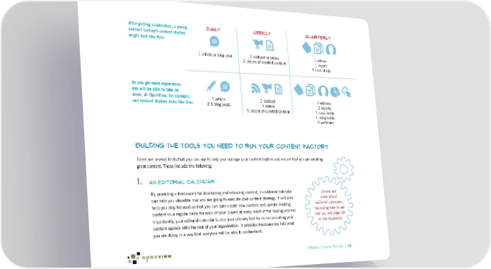 After getting established, a young DAILY WEEKLY Quarterly content factory’s content rhythm might look like this: 1 article or blog post 1 podcast or video 1 eBook 2 pieces of curated content 1 report 1 case study As you get more experience, you will be able to take on more. At OpenView, for example, 1 article 1 podcast 2 eBooks our content rhythm looks like this: 2-3 blog posts 3 videos 2 reports 5 pieces of curated content 1 case study 1 infographic 5 webinars Building the Tools You Need to Run Your Content Factory There are several tools that you can use to help you manage your content rhythm and ensure that you are creating great content. These include the following: 1. An editorial calendar By providing a framework for developing and releasing content, an editorial calendar To find out can help you visualize how you are going to execute your content strategy. It will also more about help you stay focused so that you can both create new content and update existing editorial calendars, content on a regular basis for each of your buyers at every point of the buying process. including how to set Importantly, your editorial calendar is also your primary tool for communicating your one up, see page 90 content agenda with the rest of your organization. It provides transparency into what in the Appendix. you are doing in a way that everyone will be able to understand. It Takes a Content Factory! | 49
