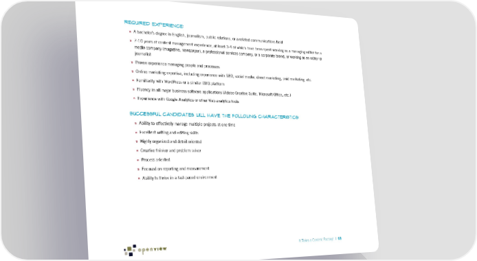 Required experience: » A bachelor’s degree in English, journalism, public relations, or a related communications field » 7-10 years of content management experience, at least 3-4 of which have been spent working as a managing editor for a media company (magazine, newspaper), a professional services company, or a corporate brand, or working as an editor or journalist » Proven experience managing people and processes » Online marketing expertise, including experience with SEO, social media, direct marketing, paid marketing, etc. » Familiarity with WordPress or a similar CMS platform » Fluency in all major business software applications (Adobe Creative Suite, Microsoft Office, etc.) » Experience with Google Analytics or other Web analytics tools Successful candidates will have the following characteristics: » Ability to effectively manage multiple projects at one time » Excellent writing and editing skills » Highly organized and detail oriented » Creative thinker and problem solver » Process oriented » Focused on reporting and measurement » Ability to thrive in a fast-paced environment It Takes a Content Factory! | 68