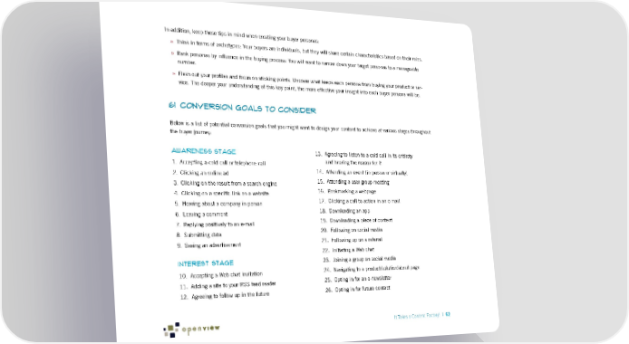 In addition, keep these tips in mind when creating your buyer personas: » Think in terms of archetypes: Your buyers are individuals, but they will share certain characteristics based on their roles. » Rank personas by influence in the buying process: You will want to narrow down your target personas to a manageable number. » Flesh out your profiles and focus on sticking points: Uncover what keeps each persona from buying your product or ser- vice. The deeper your understanding of this key point, the more effective your insight into each buyer persona will be. 61 Conversion Goals to Consider Below is a list of potential conversion goals that you might want to design your content to achieve at various stages throughout the buyer journey: Awareness Stage 13. Agreeing to listen to a cold call in its entirety 1. Accepting a cold call or telephone call and hearing the reason for it 2. Clicking an online ad 14. Attending an event (in person or virtually) 3. Clicking on the result from a search engine 15. Attending a user group meeting 4. Clicking on a specific link on a website 16. Bookmarking a webpage 5. Hearing about a company in person 17. Clicking a call to action in an e-mail 6. Leaving a comment 18. Downloading an app 7. Replying positively to an e-mail 19. Downloading a piece of content 8. Submitting data 20. Following on social media 9. Seeing an advertisement 21. Following up on a referral 22. Initiating a Web chat Interest Stage 23. Joining a group on social media 10. Accepting a Web chat invitation 24. Navigating to a product/solution/about page 11. Adding a site to your RSS feed reader 25. Opting in for an e-newsletter 12. Agreeing to follow up in the future 26. Opting in for future contact It Takes a Content Factory! | 62