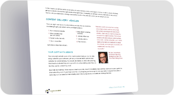 In this chapter, we will look at the combination of content delivery vehicles and programs that you should be using to effectively get your content in front of the right people at the right times. Importantly, you will learn not only what tactics to use, but also how to scale your distribution strategy appropriately based on the particular content you are trying to promote. Content Delivery Vehicles There are eight main types of content delivery vehicles that you should be “Marketers need to remember that of all the considering to get your content out to your target audience: places their content could live online, their own website probably gets the least amount 1. Your company’s website 5. Other direct marketing of traffic. That’s why you need to embrace the 2. Other websites that channels concept of the digital dandelion. Think of your you can control 6. Industry influencers website as the stalk and your content as those 3. Social media channels 7. Industry partners fuzzy seeds. Just like a dandelion, your content 4. Your e-newsletter 8. Paid channels starts on the stalk but should also be spread far and wide, and repackaged, repurposed, and Let’s take a closer look at each. redistributed in as many places as possible.” Your Company's Website Jay Baer, Social Media and Content Marketing Your company’s website is one of the most important tools you have for deliv- Strategist and New York ering content to your customers, yet many companies fail to optimize their Times Best-Selling Author websites for content delivery. As a result, site visitors are often left scratching their heads about what they are supposed to do and wondering where they can find the specific content they need. Don’t fall into that trap. When anyone comes to your site, make it immediately clear what they need to do to quickly get to the information they need. A great way to do this is by designing your homepage to encourage visitors to segment themselves in some way, such as based on their industry, role in the buying process, or a particular challenge they face. It Takes a Content Factory! | 31