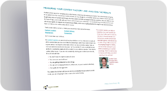Measuring Your Content Factory and Analyzing the Results Another critical aspect of managing your content factory is tracking and analyzing your results. Your content factory isn’t going to be perfect from the moment you build it. At first, you may struggle to consistently maintain your desired content rhythm and to get every piece of content out through all of the possible vehicles and programs that you would like. And, even after you mas- ter these things, your results will vary in terms of the impact your content has. The important thing is to hold yourself account- able to your goals, to measure the impact of your efforts, and to make ongoing adjustments along the way based on what you learn so that you are continuously able to improve. That’s where metrics come in. Initially you should track them across four areas: “As a content marketer, your daily ret- Content creation Content delivery rospective is the most important part Impressions Conversions of your day. It offers you the chance to look back on the previous day’s con- Let’s break down each of these. tent and ask yourself what went well, For content creation, you are simply tracking whether or not you were able to create all what didn’t go well, and what can you of the content that you have committed to producing as part of your content rhythm for do better. Doing so will ensure you’re a given period. Tracking this information (which can be as simple as saying “yes, we not just going through the motions, met our content commitments this week” or “no, we didn’t”) puts a spotlight on your but consistently learning from your ability to consistently create all of the content on your editorial calendar. That helps to efforts and adapting your approach surface other issues. If you are not consistently meeting your content commitments, accordingly. That’s the only true way it could indicate that: to improve and to take your content marketing to the next level.” » You don’t have the right resources in place » Your processes are inefficient Jonathan Crowe, » You are getting distracted by other things Managing Editor, OpenView Venture » You are not leveraging freelancers, influencers, or your co-workers effectively Partners » Your goals are too aggressive The bottom line is that until you are able to consistently hit your content commit- ments, you are not going to have a successful content factory. It Takes a Content Factory! | 51