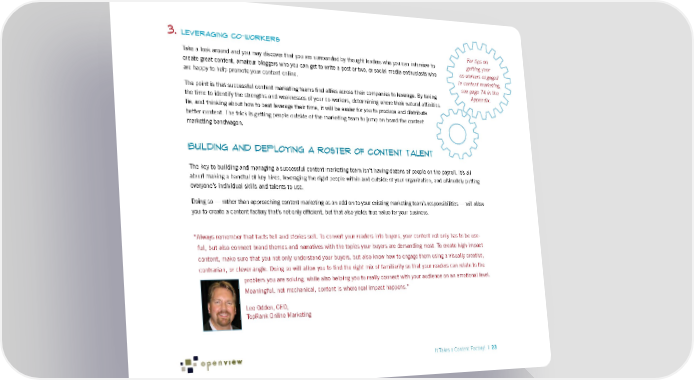 3. Leveraging Co-workers For tips on Take a look around and you may discover that you are surrounded by thought leaders who you can interview to getting your create great content, amateur bloggers who you can get to write a post or two, or social media enthusiasts who co-workers engaged are happy to help promote your content online. in content marketing, see page 74 in the The point is that successful content marketing teams find allies across their companies to leverage. By taking Appendix. the time to identify the strengths and weaknesses of your co-workers, determining where their natural affinities lie, and thinking about how to best leverage their time, it will be easier for you to produce and distribute better content. The trick is getting people outside of the marketing team to jump on board the content marketing bandwagon. Building and Deploying a Roster of Content Talent The key to building and managing a successful content marketing team isn’t having dozens of people on the payroll. It’s all about making a handful of key hires, leveraging the right people within and outside of your organization, and ultimately putting everyone’s individual skills and talents to use. Doing so — rather than approaching content marketing as an add-on to your existing marketing team’s responsibilities — will allow you to create a content factory that’s not only efficient, but that also yields true value for your business. “Always remember that facts tell and stories sell. To convert your readers into buyers, your content not only has to be use- ful, but also connect brand themes and narratives with the topics your buyers are demanding most. To create high-impact content, make sure that you not only understand your buyers, but also know how to engage them using a visually creative, contrarian, or clever angle. Doing so will allow you to find the right mix of familiarity so that your readers can relate to the problem you are solving, while also helping you to really connect with your audience on an emotional level. Meaningful, not mechanical, content is where real impact happens.” Lee Odden, CEO, TopRank Online Marketing It Takes a Content Factory! | 23