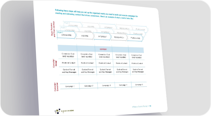 Following these steps will help you set up the organized matrix you need to build and execute campaigns for creating and delivering content that drives conversions. Here’s an example of what a matrix looks like: Buyer 3 UNAWARE AWARE Interest research purchase Buyer 2 UNAWARE AWARE Interest research purchase Buyer 1 Buyer Personas UNAWARE AWARE Interest research purchase and Their Journeys CONTEXT Conversion Goal Conversion Goal Conversion Goal Conversion Goal Conversion Goal (and Incentive) (and Incentive) (and Incentive) (and Incentive) (and Incentive) Points of Contact Points of Contact Points of Contact Points of Contact Points of Contact Campaign Design Content Format Content Format Content Format Content Format Content Format and Key Messages and Key Messages and Key Messages and Key Messages and Key Messages Campaign 1 Campaign 2 Campaign 3 Campaign 4 Campaign 5 Campaign Execution It Takes a Content Factory! | 16
