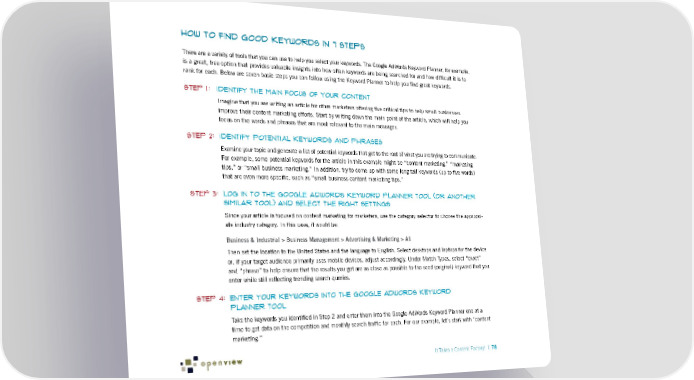 How to Find Good Keywords in 7 Steps There are a variety of tools that you can use to help you select your keywords. The Google AdWords Keyword Planner, for example, is a great, free option that provides valuable insights into how often keywords are being searched for and how difficult it is to rank for each. Below are seven basic steps you can follow using the Keyword Planner to help you find great keywords. Step 1: Identify the main focus of your content Imagine that you are writing an article for other marketers offering five critical tips to help small businesses improve their content marketing efforts. Start by writing down the main point of the article, which will help you focus on the words and phrases that are most relevant to the main messages. Step 2: Identify potential keywords and phrases Examine your topic and generate a list of potential keywords that get to the root of what you are trying to communicate. For example, some potential keywords for the article in this example might be “content marketing,” “marketing tips,” or “small business marketing.” In addition, try to come up with some long-tail keywords (up to five words) that are even more specific, such as “small business content marketing tips.” Step 3: Log in to the Google AdWords Keyword Planner tool (OR ANOTHER SIMILAR TOOL) and select the right settings Since your article is focused on content marketing for marketers, use the category selector to choose the appropri- ate industry category. In this case, it would be: Business & Industrial > Business Management > Advertising & Marketing > All Then set the location to the United States and the language to English. Select desktops and laptops for the device or, if your target audience primarily uses mobile devices, adjust accordingly. Under Match Types, select “exact” and “phrase” to help ensure that the results you get are as close as possible to the seed (original) keyword that you enter while still reflecting trending search queries. Step 4: Enter your keywords into the Google AdWords Keyword Planner tool Take the keywords you identified in Step 2 and enter them into the Google AdWords Keyword Planner one at a time to get data on the competition and monthly search traffic for each. For our example, let’s start with “content marketing.” It Takes a Content Factory! | 78