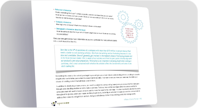 » Behavioral information What’s motivating the buyer? Is there a specific problem she faces that you can solve? What are her concerns and pain points? What are her expectations? Which of her needs have to be met to ensure a purchase? » Company information How big is the company? What’s the industry? Where is it located? To learn more » Demographic information about the buyer about buyer personas, see What department does the buyer sit in? What budget does he have? What are his primary page 61 in responsibilities? the Appendix. Once you have gathered as much information as you can, synthesize the most pertinent details into a short description like this: Jane Doe is the VP of operations at a company with more than $10 million in annual revenue that needs a better e-mail archiving solution. She finds her existing service frustrating because it is too slow and unreliable. She will generally get involved in the research phase of the buying process and is the final decision-maker. She is aware of our solution and that her pain points directly align with our product’s core value proposition. While price is an important motivating factor when making a purchase, she’s most concerned with whether the solution offers the functionality and ease of use she’s looking for. Completing this exercise for each of your target buyers will give you a much clearer understanding of them, resulting in valuable insights into how to tailor your content to ensure that it resonates. The more human you make your personas, the better your chance of creating content that will truly speak to them. In addition to developing a buyer persona, you need to analyze the corresponding buyer journey or process that the buyer goes through when deciding whether or not to make a purchase. To do so, map out the key stages within the process and try to anticipate what will need to happen at each point to move the buyer to the next stage. It is also important to identify the points throughout the journey where your buyers are likely to get stuck, and to figure out what messages you need to communicate to address their concerns and get them unstuck. Doing so will allow you to turn those sticking points into leverage points. It Takes a Content Factory! | 11