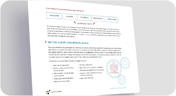 A very simplified five-stage buying process might look like this: UNAWARE AWARE Interest research purchase Leverage Points For expansion-stage companies, the leverage points are usually at the awareness and research stages. These are crucial junc- tures where you should look to focus your efforts most to help improve sales. Many potential buyers may not be aware of your company or your solution, while those doing research may be ready to make a purchase. By understanding the buyer journey as well as where your buyers are likely to get stuck — and why — you can create the content necessary to address their concerns and propel them through the buyer journey. 3. Setting Clear Conversion Goals Once you understand who your targets are, what they care about, and the steps along their buying journey, you need to decide what actions you want them to take as a result of consuming your content. Ultimately you want to convert your target buyers into paying customers, and the way to make that happen is by getting them to take a series of much smaller actions that will collectively help propel them through the buyer journey. Each of those actions is a conversion, and you should set a series of conversion goals for your target buyers based on the content you have delivered to them. For example, your goal might be to get your target buyers to: For a » Open one of your e-mails » Fill out a contact form comprehensive » Spend a certain amount of time » Sign up for your e-mail list or newsletter list of potential on your website » Download your latest eBook or case study conversion goals, » Visit a specific number of pages see page 62 » Engage in a live chat with one of your in the Appendix. on your website customer service reps » Share your content with others » Sign up for a free trial » Watch one of your videos It Takes a Content Factory! | 12