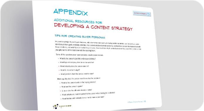 Go Back to Chapter 2 Appendix Additional Resources for Developing a Content Strategy Tips for Creating Buyer Personas As your knowledge of your buyers deepens, add color to the personas by including additional details, such as what you under- stand about their goals and daily activities, the current solutions to their problems, whether there is room for improvement with those solutions, and what types of media they consume. You should also try to understand where they spend time online so that you get a sense of the best channels for reaching them. Some of the questions your buyer personas should answer include: » What is the person’s job title and responsibilities? » What type of company does he or she work for? » What industry does the person work in? » What is his or her budget? » What problem does the person need to solve? How urgently does the person need to resolve the problem? » What is the person’s role in the buying process? » What are the person’s goals? » Is he or she the ultimate decision-maker? » What criteria are most important to the person when looking for a solution? » What factors will motivate him or her to make a purchase? It Takes a Content Factory! | 61