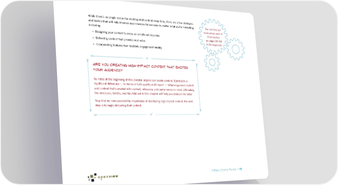 While there’s no single recipe for creating viral content every time, there are a few strategies and tactics that will help improve your chances for success no matter what you’re marketing, You can find out including: more about each of » Designing your content to evoke an emotional response these tactics on pages 83-84 » Delivering content that provides real value in the Appendix. » Incorporating features that facilitate engagement virality 8" Are You Creating High-Impact Content that Excites Your Audience? As noted at the beginning of this chapter, anyone can create content. But there’s a significant difference — in terms of both quality and impact — between general content and content that’s created with context, relevance, and performance in mind. Ultimately, the processes, tactics, and tips laid out in this chapter will help you produce the latter. Now that we have covered the importance of developing high-impact content, the next step is to begin delivering that content. 8" It Takes a Content Factory! | 29