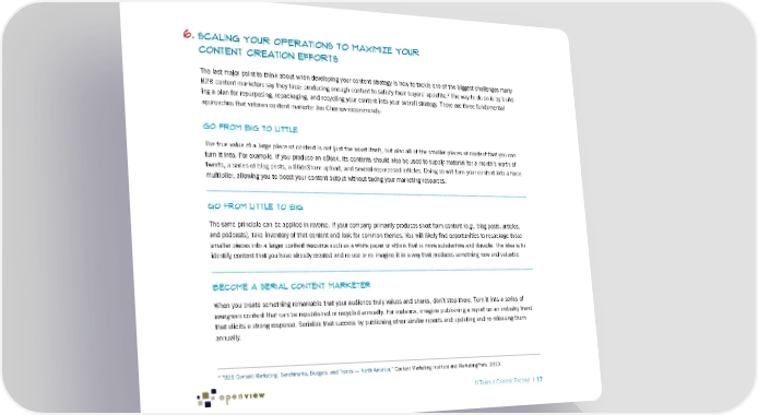 6. Scaling Your Operations to Maximize Your Content Creation Efforts The last major point to think about when developing your content strategy is how to tackle one of the biggest challenges many 2 B2B content marketers say they face: producing enough content to satisfy their buyers’ appetite. The way to do so is by build- ing a plan for repurposing, repackaging, and recycling your content into your overall strategy. There are three fundamental approaches that veteran content marketer Joe Chernov recommends: Go from Big to Little The true value of a large piece of content is not just the asset itself, but also all of the smaller pieces of content that you can turn it into. For example, if you produce an eBook, its contents should also be used to supply material for a month’s worth of tweets, a series of blog posts, a SlideShare upload, and several repurposed articles. Doing so will turn your content into a force multiplier, allowing you to boost your content output without taxing your marketing resources. Go From Little to Big The same principle can be applied in reverse. If your company primarily produces short-form content (e.g., blog posts, articles, and podcasts), take inventory of that content and look for common themes. You will likely find opportunities to repackage those smaller pieces into a larger content resource such as a white paper or eBook that is more substantive and durable. The idea is to identify content that you have already created and re-use or re-imagine it in a way that produces something new and valuable. Become a Serial Content Marketer When you create something remarkable that your audience truly values and shares, don’t stop there. Turn it into a series of evergreen content that can be republished or recycled annually. For instance, imagine publishing a report on an industry trend that elicits a strong response. Serialize that success by publishing other similar reports and updating and re-releasing them annually. 2 “B2B Content Marketing: Benchmarks, Budgets, and Trends — North America,” Content Marketing Institute and MarketingProfs, 2013. It Takes a Content Factory! | 17
