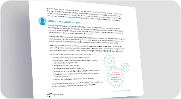 Make no mistake about it, building a content factory is an investment, and that investment starts with hiring a dedicated, full- time team for the job. The good news is that you can keep that team relatively small, provided that you augment it with the support of freelancers and industry influencers, and get other people throughout your company engaged in the effort. To lead that team, you must fill the one role that is absolutely essential for running an effective content factory: a managing editor. Hiring a Managing Editor If you can only hire one person to build your content factory, it needs to be a factory foreman who is capable of not only developing a content strategy, but also marshaling and managing all of the resources necessary to execute it and measure its success. At expansion-stage technology companies, that role is often best filled by a managing editor (other job titles that fill similar roles include director of content marketing and VP of content). Reporting to the CMO, an experienced managing editor will typically possess a combination of deep editorial and project management expertise as well as a firm grasp of online marketing. He or she should be responsible for overseeing and optimizing your company’s content creation and distribution processes, as well as ensuring the quality and timely publication of all of your content. While impeccable writing and editing skills are essential, it’s important to note that the managing editor’s time should not be spent creating content. Instead, he or she will be managing a team, setting your editorial agenda, removing any impediments that are preventing your content factory from running smoothly, measuring its performance, and continually striving to improve it. Some of the managing editor’s other responsibilities may include: » Creating and managing the company’s editorial calendar » Overseeing the creation of all content and ensuring that it is error free, optimized, and of the highest quality » Managing other content team members » Building and managing a stable of freelancers » Ensuring that all content is of the highest quality and delivered on time » Managing an error free, SEO-optimized corporate blog site and regularly For a sample contributing posts to it job description for » Tracking and analyzing key metrics to help inform the strategy a managing editor, see page 67 in the Hiring the right managing editor is essential to the success of your content factory, Appendix. so make sure that you are finding the best person possible for the role. It Takes a Content Factory! | 20