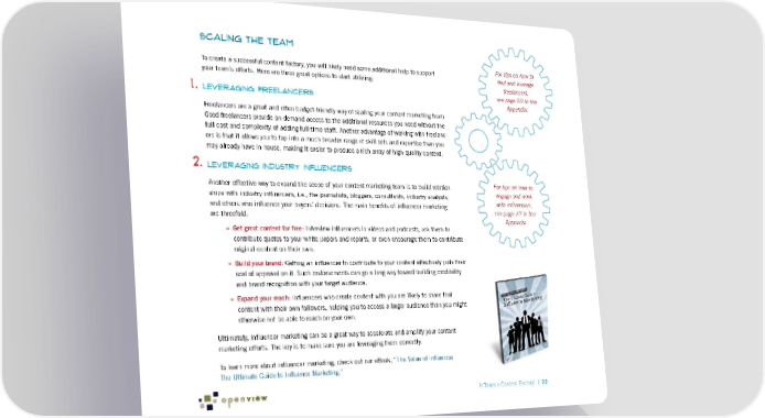 Scaling the Team To create a successful content factory, you will likely need some additional help to support For tips on how to your team’s efforts. Here are three great options to start utilizing: find and manage freelancers, 1. Leveraging Freelancers see page 69 in the Appendix. Freelancers are a great and often budget-friendly way of scaling your content marketing team. Good freelancers provide on-demand access to the additional resources you need without the full cost and complexity of adding full-time staff. Another advantage of working with freelanc- ers is that it allows you to tap into a much broader range of skill sets and expertise than you may already have in-house, making it easier to produce a rich array of high-quality content. 2. Leveraging Industry Influencers Another effective way to expand the scope of your content marketing team is to build relation- For tips on how to ships with industry influencers, i.e., the journalists, bloggers, consultants, industry analysts, engage and work and others who influence your buyers’ decisions. The main benefits of influencer marketing with influencers, are threefold: see page 72 in the Appendix. » Get great content for free: Interview influencers in videos and podcasts, ask them to contribute quotes to your white papers and reports, or even encourage them to contribute original content on their own. » Build your brand: Getting an influencer to contribute to your content effectively puts their seal of approval on it. Such endorsements can go a long way toward building credibility and brand recognition with your target audience. » Expand your reach: Influencers who create content with you are likely to share that content with their own followers, helping you to access a larger audience than you might otherwise not be able to reach on your own. Ultimately, influencer marketing can be a great way to accelerate and amplify your content marketing efforts. The key is to make sure you are leveraging them correctly. To learn more about influencer marketing, check out our eBook, “The Value of Influence: The Ultimate Guide to Influence Marketing.” It Takes a Content Factory! | 22