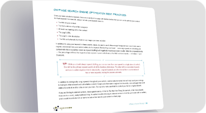 On-page Search Engine Optimization Best Practices Once you have selected a keyword, there are a variety of on-page optimization tactics that you can use to optimize your content for that keyword. For example, always include your keyword phrase in: » The title of your content » The first sentence of your first paragraph » At least one heading within the content » The page’s URL » The page’s meta description » The title and alternate text field of any images you have included In addition to using your keyword in these specific places, be sure to use it often enough throughout your copy to help search engines understand how your content relates to the keyword. But don’t go overboard — overusing keywords or saturating your content with them (a practice known as keyword stuffing) will negatively impact your search results. Strive for a keyword density — the percentage of times the keyword phrase appears in your content versus the total number of words — of between 1 and 3 percent. 8" Tip: While you should always keyword stuffing, you can use more than one keyword in a single piece of content. One will be the primary keyword used in all of the locations cited above. The other will be a secondary keyword, and can be added anywhere that it naturally fits. Long tail keywords are often formed from a combination of two or more keywords, making the process automatic. 8" In addition to strategically using keywords throughout your content, another valuable tactic that will help boost your rankings is linking to other relevant and authoritative content. Google and other search engines look favorably upon webpages that point visitors to content on other sites or even your own. The key is to make sure that the content you link to is highly relevant. If you are linking to external content, choose great sources. A link to The New York Times, for example, is far more valuable than one to a small, poorly trafficked blog. An added benefit of linking to external content is that the webmaster will be notified, which could incentivize him or her to include a link back to your content on their page. It Takes a Content Factory! | 80