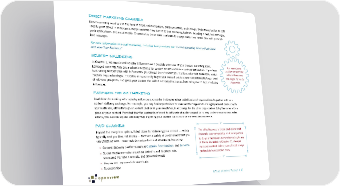 Direct Marketing Channels Direct marketing used to take the form of direct mail campaigns, print newsletters, and catalogs. While those tactics are still used to great effect in some cases, many marketers have turned to their online equivalents, including e-mail, text messages, push notifications, and social media. Channels like these allow marketers to engage consumers in real time with personal- ized messages. For more information on e-mail marketing, including best practices, see “E-mail Marketing: How to Push Send and Grow Your Business.” Industry Influencers In Chapter 3, we mentioned industry influencers as a possible extension of your content marketing team. For more infor- Leveraged correctly, they are a valuable resource for content creation and also content distribution. If you have mation on working built strong relationships with influencers, you can get them to share your content with their audiences, which with influencers, has two huge advantages: It creates an opportunity to get your content out to a new and potentially larger pool see page 72 in the of relevant prospects, and gives your content the added authority that comes from being shared by an industry Appendix. influencer. Partners for Co-Marketing In addition to working with industry influencers, consider looking for other individuals and organizations to partner with in a content delivery exchange. For example, you may find opportunities to share another organization’s highly relevant content with your audience, either through an e-mail blast or in your newsletter, in exchange for the other organization doing the same with a piece of your content. Provided that the content is relevant to both sets of audiences and in no way undermines your own sales efforts, this can be a quick and easy way of getting your content out in front of an expanded audience. Paid Channels 2" Beyond the many free options listed above for delivering your content — which The effectiveness of these and other paid typically cost you time, not money — there are a variety of paid channels that you channels can vary greatly, so it is important can utilize as well. These include various forms of advertising, including: to do your homework before investing in any » Content discovery platforms such as Outbrain, StumbleUpon, and Zemanta of them. As noted in Chapter 2, cheaper forms of content delivery are almost always » Social media promotions such as LinkedIn and Facebook ads, preferable to expensive ones. sponsored YouTube channels, and promoted tweets » Display and pay-per-click search ads 2" » Sponsorships It Takes a Content Factory! | 37