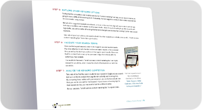 Step 5: Explore other keyword options Seeing that the competition and monthly searches for “content marketing” are high, we can assume that we are going to have a difficult time ranking for it. Fortunately, the tool suggests a variety of other related keywords that we can consider using instead. Not all of the suggested keywords are relevant, so focus on the ones that align with your content and that have both low competition and moderate monthly search traffic. While it may be tempting to go after keywords with high traffic, you will be better off ranking first for terms that get searched less than ranking 51st for more popular keywords. Take note of your best options and experiment with the other keywords you initially came up with. “Small business content marketing tips” looks like a good option. Step 6: Validate your search terms Once you find a good keyword, enter it into Google to see what results it yields. Pay close attention to both the first and second search results in the sponsored links as well as the first four positions in the organic search results. Make sure that the content that comes up for your search aligns thematically with the content you have created. The results for the search “small business content marketing tips” are highly relevant to our article, which means the intent of the keyword is a match for our article. Step 7: Analyze the keyword competition Take note of the first five search results for your keyword in Google and use a search For more keyword research tool such as Moz to analyze their page/domain authority and incoming links. tips and strategies By comparing those metrics with your company’s, you can further evaluate how download our free eBook, likely you are to rank well for that keyword. If your chances of ranking high for “Better Research, Better that keyword are low, you may want to look for a different option. Customers: A Business Guide For our purposes, “small business content marketing tips” is a great choice. to Keyword Generation.” It Takes a Content Factory! | 79