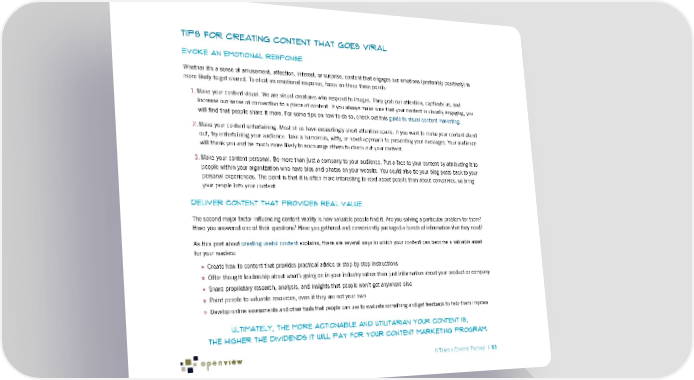 Tips for Creating Content that Goes Viral Evoke an Emotional Response Whether it’s a sense of amusement, affection, interest, or surprise, content that engages our emotions (preferably positively) is more likely to get shared. To elicit an emotional response, focus on these three points: 1. Make your content visual. We are visual creatures who respond to images. They grab our attention, captivate us, and increase our sense of connection to a piece of content. If you always make sure that your content is visually engaging, you will find that people share it more. For some tips on how to do so, check out this guide to visual content marketing. 2. Make your content entertaining. Most of us have exceedingly short attention spans. If you want to make your content stand out, try entertaining your audience. Take a humorous, witty, or novel approach to presenting your messages. Your audience will thank you and be much more likely to encourage others to check out your content. 3. Make your content personal. Be more than just a company to your audience. Put a face to your content by attributing it to people within your organization who have bios and photos on your website. You could also tie your blog posts back to your personal experiences. The point is that it is often more interesting to read about people than about companies, so bring your people into your content. Deliver Content that Provides Real Value The second major factor influencing content virality is how valuable people find it. Are you solving a particular problem for them? Have you answered one of their questions? Have you gathered and conveniently packaged a bunch of information that they need? As this post about creating useful content explains, there are several ways in which your content can become a valuable asset for your readers: » Create how-to content that provides practical advice or step-by-step instructions » Offer thought leadership about what’s going on in your industry rather than just information about your product or company » Share proprietary research, analysis, and insights that people won’t get anywhere else » Point people to valuable resources, even if they are not your own » Develop online assessments and other tools that people can use to evaluate something and get feedback to help them improve Ultimately, the more actionable and utilitarian your content is, the higher the dividends it will pay for your content marketing program. It Takes a Content Factory! | 83