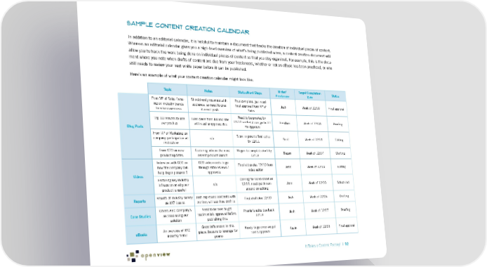 Sample Content Creation Calendar In addition to an editorial calendar, it is helpful to maintain a document that tracks the creation of individual pieces of content. Whereas an editorial calendar gives you a high-level overview of what’s being published when, a content creation document will allow you to track the work being done on individual pieces of content so that you stay organized. For example, this is the docu- ment where you note when drafts of content are due from your freelancers, whether or not an eBook has been proofread, or who still needs to review your next white paper before it can be published. Here’s an example of what your content creation calendar might look like: Topic Notes Status/Next Steps Writer/ Target Completion Status Freelancer Date From VP of Sales focus- Should really resonate with Post complete, just need ing on industry trends audience, so need to give final approval from VP of Josh Week of 12/10 Final approval to raise awareness it a real push Sales Top 10 reasons to use Idea came from Jill and she Need to be proofed by our product will need to approve this 12/10 so that it can go to Jill Jonathan Week of 12/10 Proofing Blog Posts for approval From VP of Marketing on Scott to provide final edits company participation at n/a by 12/11 Scott Week of 12/10 Editing trade show From CTO on new Featuring info on the most Megan to complete draft by Megan Week of 12/17 Drafting product updates recent product launch 12/13 Interview with CEO on CEO video needs to go Final video due 12/10 from how the company can through extra reviews / video editor Jenn Week of 12/10 Editing help buyer persona 1 approvals Videos Featuring key industry Coming for video shoot on influencer on why our n/a 12/10; need quick turn- Jenn Week of 12/10 Scheduled product is useful around on editing Reports Results of industry survey Josh expressed concerns with First draft due 12/10 Josh Week of 12/24 Drafting on XYZ issues outline; will see how draft is Covers ABC Company’s Need to be sure to get Proofer’s edits due back Case Studies success using our testimonials approved before 12/13 Josh Week of 12/17 Proofing solution publishing this An overview of XYZ Great influencers in this Ready to go once we get eBooks industry trend piece, be sure to leverage for Tom’s approval Kevin Week of 12/10 Final approval promo It Takes a Content Factory! | 92