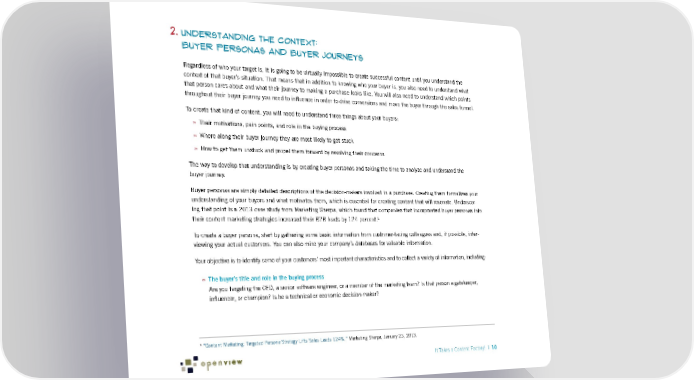 2. Understanding the Context: Buyer Personas and Buyer Journeys Regardless of who your target is, it is going to be virtually impossible to create successful content until you understand the context of that buyer’s situation. That means that in addition to knowing who your buyer is, you also need to understand what that person cares about and what their journey to making a purchase looks like. You will also need to understand which points throughout their buyer journey you need to influence in order to drive conversions and move the buyer through the sales funnel. To create that kind of content, you will need to understand three things about your buyers: » Their motivations, pain points, and role in the buying process » Where along their buyer journey they are most likely to get stuck » How to get them unstuck and propel them forward by resolving their concerns The way to develop that understanding is by creating buyer personas and taking the time to analyze and understand the buyer journey. Buyer personas are simply detailed descriptions of the decision-makers involved in a purchase. Creating them formalizes your understanding of your buyers and what motivates them, which is essential for creating content that will resonate. Underscor- ing that point is a 2013 case study from Marketing Sherpa, which found that companies that incorporated buyer personas into 1 their content marketing strategies increased their B2B leads by 124 percent. To create a buyer persona, start by gathering some basic information from customer-facing colleagues and, if possible, inter- viewing your actual customers. You can also mine your company’s databases for valuable information. Your objective is to identify some of your customers’ most important characteristics and to collect a variety of information, including: » The buyer’s title and role in the buying process Are you targeting the CEO, a senior software engineer, or a member of the marketing team? Is that person a gatekeeper, influencer, or champion? Is he a technical or economic decision-maker? 1 “Content Marketing: Targeted Persona Strategy Lifts Sales Leads 124%,” Marketing Sherpa, January 23, 2013. It Takes a Content Factory! | 10