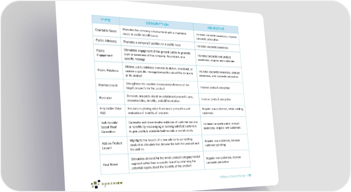 Type Description Objective Charitable Cause Promotes the company’s involvement with a charitable Increase corporate awareness, improve cause or public benefit cause corporate perception Public Advocacy Promotes a company’s position on a public issue Increase corporate awareness Public Stimulates engagement of the general public to generate Increase corporate and product Engagement buzz or awareness of the company, its product, or a awareness, acquire new customers specific message Utilizes public relations channels to deliver, broadcast, or Increase corporate awareness, product Public Relations sustain a specific message/perception about the company awareness, and corporate perception or its product Reinforcement Strengthens the positive impression/preference of the Improve product perception target prospects for the product Reminder Reminds prospects about an established product’s uses, Improve product perception characteristics, benefits, and differentiation Emphasize Value Focuses on proving value to enhance perception and Acquire new customers, retain existing Add evaluation of benefits of products customers Testimonials/ Generates and disseminates evidence of customer success Increase corporate and/or product Social Proof or benefits by encouraging or seeking satisfied customers awareness, acquire new customers Generation to give publicly available testimonials or social proofs Add-on Product Highlights the launch of a new add-on to an existing Acquire new customers, increase Launch product to stimulate the demand for both the product and customer spending the add-on Stimulates demand for the whole product category/market Acquire new customers, improve First Mover segment rather than a specific brand by informing the corporate perception potential buyers about the benefits of the product It Takes a Content Factory! | 87