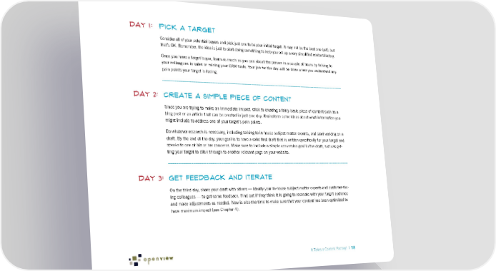 Day 1: Pick a target Consider all of your potential buyers and pick just one to be your initial target. It may not be the best one (yet), but that’s OK. Remember, the idea is just to start doing something to help you set up a very simplified content factory. Once you have a target buyer, learn as much as you can about the person in a couple of hours by talking to your colleagues in sales or mining your CRM tools. Your job for the day will be done when you understand any pain points your target is facing. Day 2: Create a simple piece of content Since you are trying to make an immediate impact, stick to creating a fairly basic piece of content such as a blog post or an article that can be created in just one day. Brainstorm some ideas about what information you might include to address one of your target’s pain points. Do whatever research is necessary, including talking to in-house subject matter experts, and start working on a draft. By the end of the day, your goal is to have a solid first draft that is written specifically for your target and speaks to one of his or her concerns. Make sure to include a simple conversion goal in the draft, such as get- ting your target to click through to another relevant page on your website. Day 3: Get feedback and iterate On the third day, share your draft with others — ideally your in-house subject matter experts and customer-fac- ing colleagues — to get some feedback. Find out if they think it is going to resonate with your target audience and make adjustments as needed. Now is also the time to make sure that your content has been optimized to have maximum impact (see Chapter 4). It Takes a Content Factory! | 58