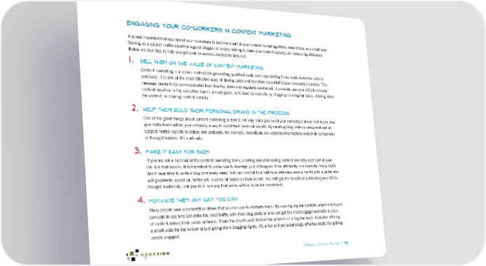 Engaging Your Co-workers in Content Marketing It is very important that you recruit your co-workers to become a part of your content marketing efforts, even if only on a small level. Serving as a subject matter expert or a guest blogger, or simply helping to share your content socially can make a big difference. Below are four tips to help you get your co-workers excited to help out: 1. Sell them on the value of content marketing Content marketing is a proven method for generating qualified leads and shepherding those leads down the path to purchase. It is one of the most effective ways of driving sales and therefore essential to your company’s success. This message needs to be communicated from the top down and regularly reinforced. If possible, ask your CEO to include content creation in the executive team’s annual goals, or to lead by example by blogging on a regular basis, offering ideas for content, or sharing content socially. 2. Help them build their personal brand in the process One of the great things about content marketing is that it not only helps you build your company’s brand, but it can also give individuals within your company a way to build their personal brands. By creating blog posts or being featured as subject matter experts in videos and podcasts, for example, individuals can establish themselves (and their companies) as thought leaders. It’s a win-win. 3. Make it easy for them If you are not a member of the content marketing team, creating and distributing content probably isn’t part of your job. For that reason, it is important to know how to leverage your colleagues’ time efficiently. For example, many CEOs don’t have time to write a blog post every week, but can commit to a half-hour interview once a month with a writer who will ghostwrite a post (or, better yet, a series of posts) on their behalf. You still get the benefit of publishing your CEO’s thought leadership, but you do it in a way that works within his or her constraints. 4. Motivate them any way you can Many people have a competitive streak that you can use to motivate them. Try running regular contests where employees compete to see who can drive the most traffic with their blog posts or who can get the most engagement with a piece of content across their social networks. Share the results and declare the winners on a regular basis. Consider offering a small prize for the winner or just giving them bragging rights. It’s a fun and yet surprisingly effective tactic for getting people engaged. It Takes a Content Factory! | 74